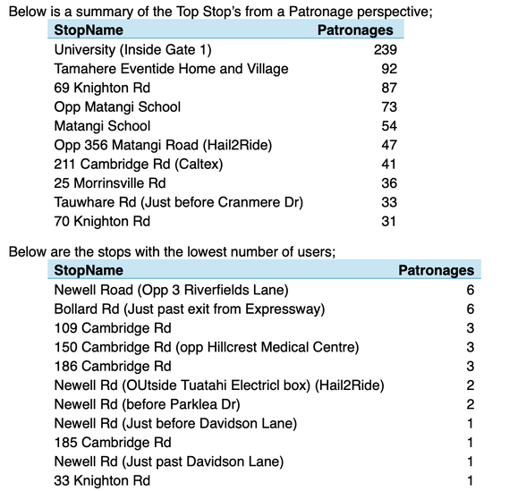 It is evident the University stop is the most popular followed by. the Eventide Home.
