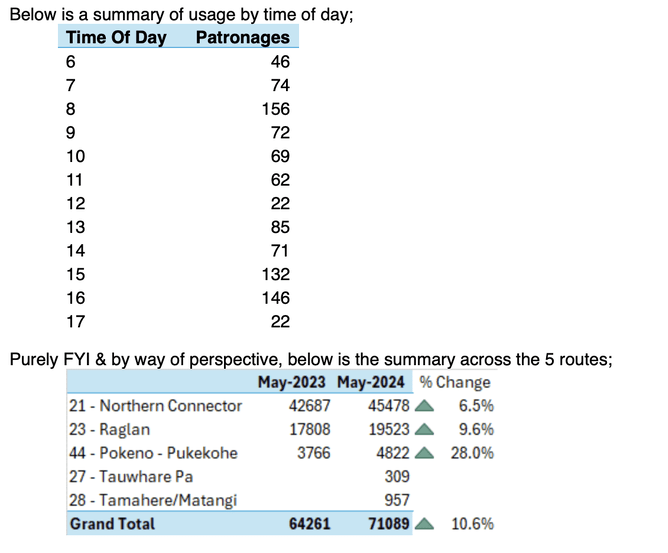 Latest patronage data for the new Tamahere-Tauwhare bus service is growing as more people seek public transport rather than using their own vehicles. The data shows Tamahere/Tauwhare residents are definitely taking advantage of the service in concert with workers coming from Hamilton to work and return from the Tamahere Eventide Home and Village.