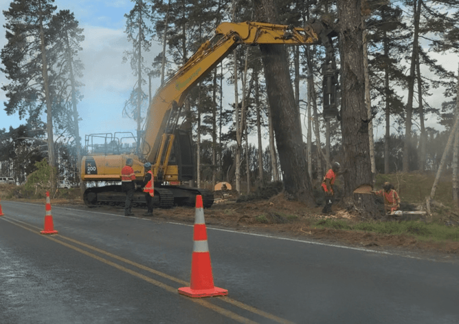 The trees, once part of a larger pine planting typical of earlier land use practices, were nearing the end of their life cycle. With disease setting in and increasing storm activity across the region, the risk of falling branches or entire trees toppling onto the road was no longer theoretical — it was imminent.
