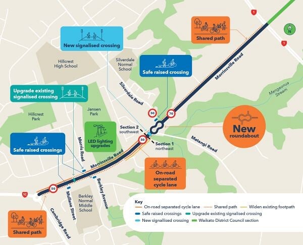 · A shared walking and cycling path, on the western side of Morrinsville Road, between the new pedestrian crossing and East Ridge Grove.