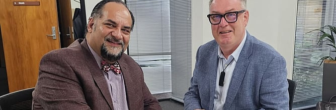 Image shows WDC Mayor Aksel Bech and Peter Winder, CEO of IAWAI signing the agreement....